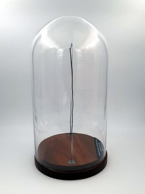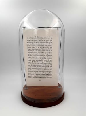 Le feuillet, suspendu à un fin portique de fil de fer, rend visible non seulement la page concernée mais aussi la suivante qui a donné sa forme à l'œuvre. Au recto, les signes é _ _ _ _ _ _ n tracés sur le socle invitent au jeu du pendu et désignent le mot coquillé.